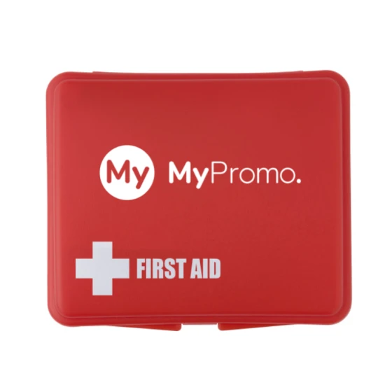 First aid kit in PP case, including: five plasters, two alcohol pads, nonwoven tape, a pair of scissors, and a nonwoven sponge.