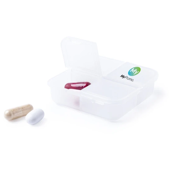 Pill box with 4 compartments in translucent finishing ABS, BPA free material. Individual lid per compartment.
