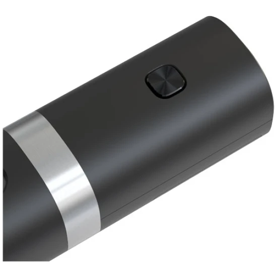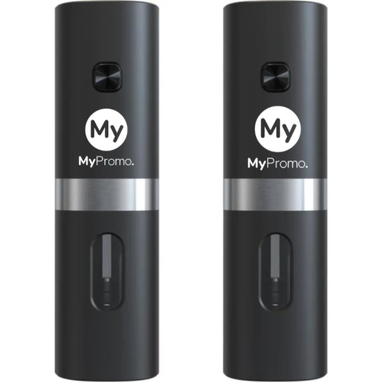 Electric pepper and salt grinder set with a blue LED light that lights up when switched on to control the flow of salt/pepper. Each grinder (17.8 x 5.1 cm) is equipped with a battery which can be recharged directly on the base. The base can also be personalised with a light-up logo. Both grinders are equipped with a transparent tank to easily distinguish the contents inside, and they can be used approximately 200 times on a single charge. Supplied with a charging base (15.5 x 8 x 2.5 cm) with a rubber soft-touch finish. Packed in recycled kraft paper box (17.7 x 23.4 x 8.5 cm). Includes 3 year warranty. ABS Plastic, Aluminium.