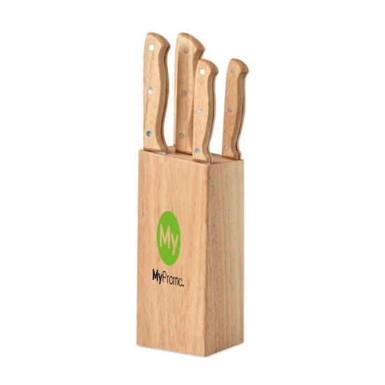 Wooden knife set. Includes base holder and 5 knives: Chef, bread, slicing, multi-functional and paring. Stainless steel with wooden handle.