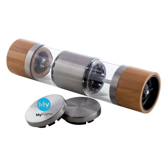 Double sided manual salt and pepper mill in stainless steel and bamboo housing, with ceramic grinder core.