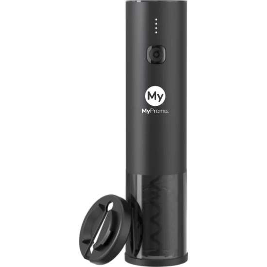 Electric corkscrew (18.8 x 4.4 cm) allowing you to open a bottle of wine in approximately 8 seconds without any effort. The top of the corkscrew can be personalised with a light-up logo. It is equipped with a 500 mAh integrated battery that is rechargeable via a USB-C connector. The corkscrew can open up to 50 bottles on a single charge. A blue LED light indicates when it is switched on. The base provides good stability to the device and also serves as a foil cutter. Packed in recycled kraft paper box (20 x 7.2 x 5.8 cm). Includes 3 year warranty. ABS Plastic, Stainless Steel.