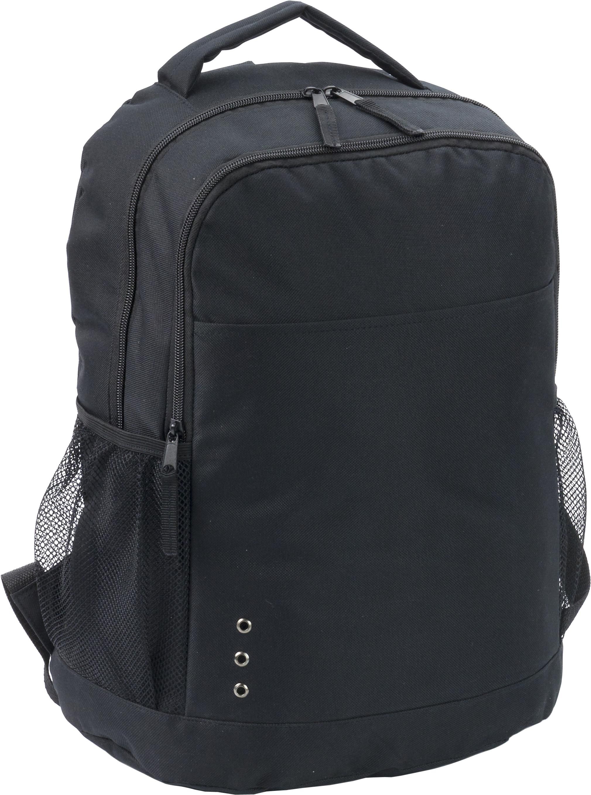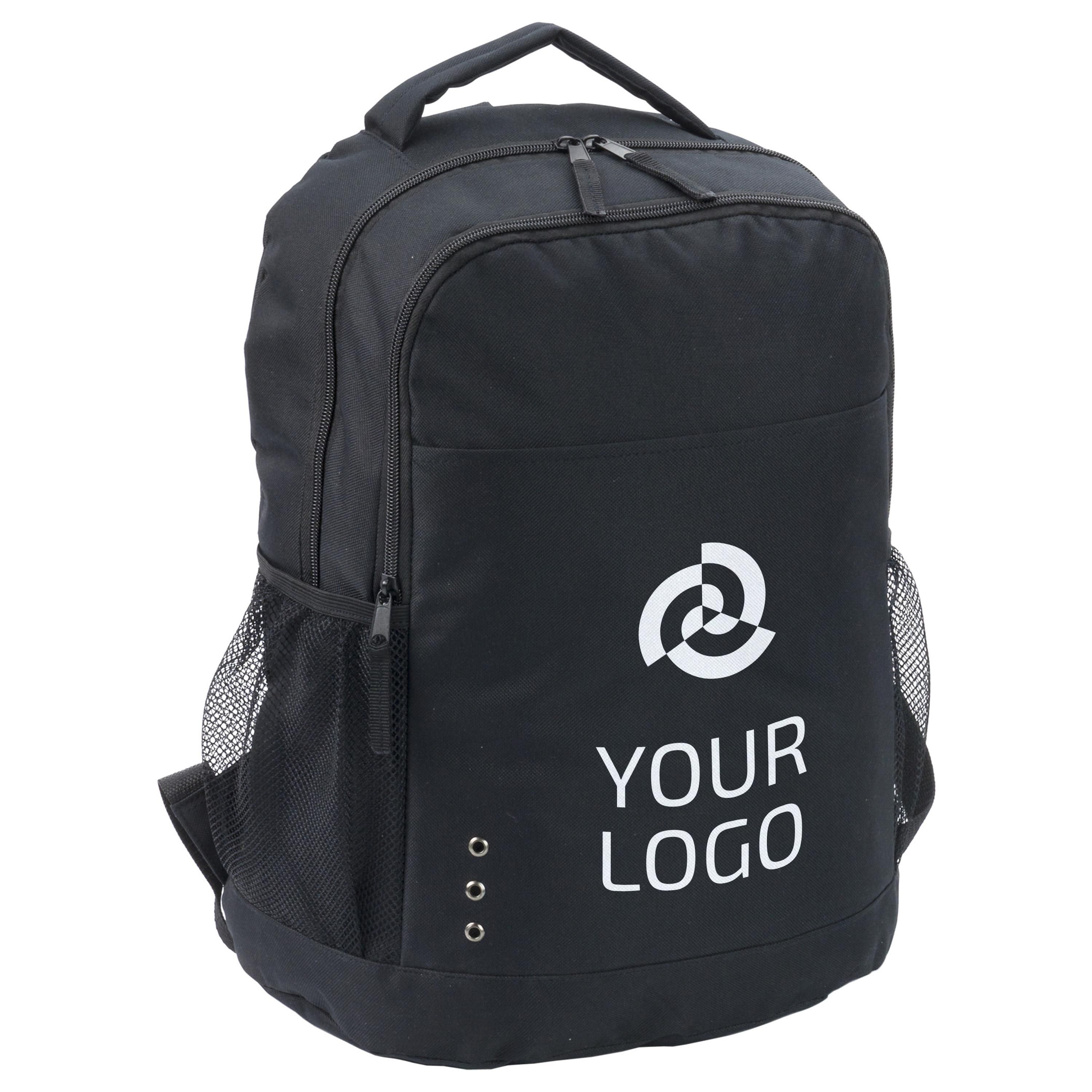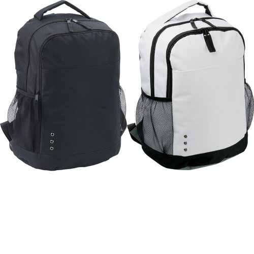 Polyester (600D) backpack with zippered front pocket, 2 mesh side pockets, and adjustable shoulder straps.