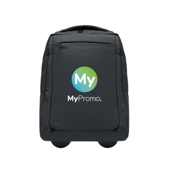 Laptop backpack trolley with wheels in 600D RPET polyester. Includes one internal 15 inch laptop compartment. Zippered front pocket. Two side slip pockets. Three inner slip pockets. Padded back and shoulder straps. 2 wheels and double tube frame.