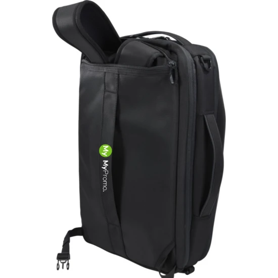 A 2-in-1 eco-friendly briefcase that converts into a backpack for easier business travel. Features dedicated pockets for a 16" MacBook® or 15.6" PC, and a 10.5" tablet. Multiple internal organisation pockets to secure contents in briefcase or backpack mode, and a removable, padded shoulder strap to carry comfortably in briefcase mode. Produced with 100% GRS certified recycled 1680 polyester material with YKK zippers. Recycled Polyester, 1680D.