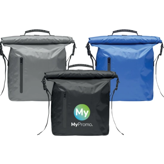 RPET 210D polyester waterproof rolltop backpack. Capacity: 30L.