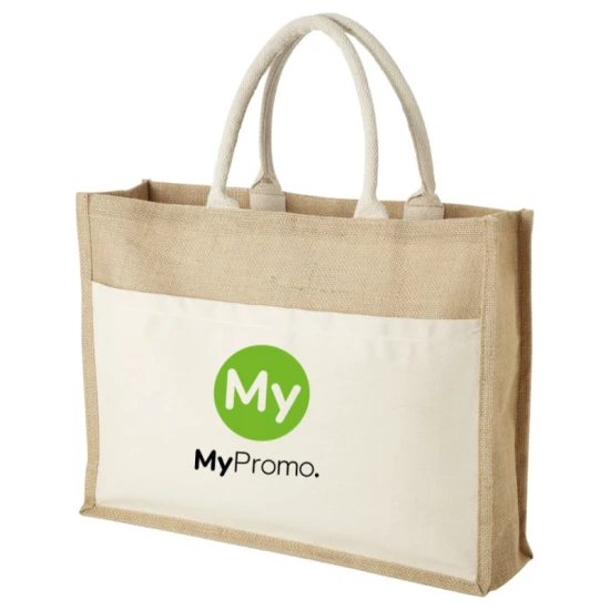 The bag has a large main compartment and front pocket to easily store any small items. It consists of jute and canvas, which means the tote bag is a great option when looking for a more sustainable shopper bag. The fabric's density of 320 g/m2 makes the bag super sturdy, long-lasting and suitable to carry heavy items in the main compartment. Jute, Canvas, 320 g/m2.