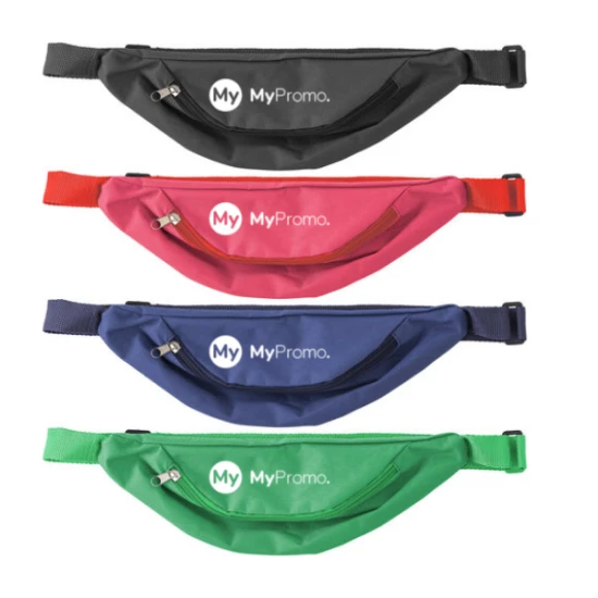 Oxford fabric (600D) waist bag with zippered pocket at the front and back and an adjustable strap.
