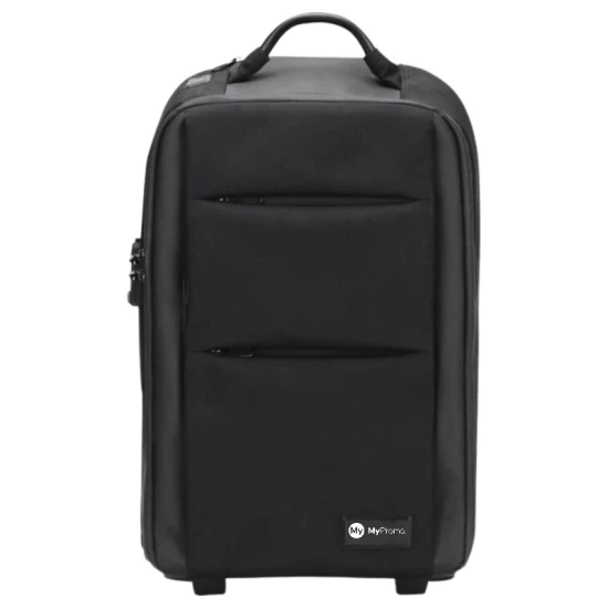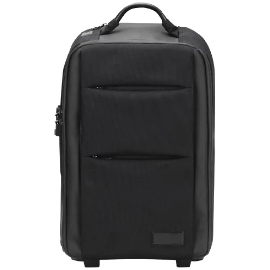 Convertible laptop trolley backpack (55 x 34 x 22 cm) made of recycled PET (equivalent to 31 recycled bottles) in 1680D waterproof fabric. Non-deformable structure and padded bottom for great protection of the bag contents. Features a padded compartment for a laptop or tablet, a metal handle and removable power bank for airport security. Equipped with an RFID secure pocket and a padlock to keep contents safe. A pocket at the back allows you to uncover the straps to convert the trolley into a backpack. Equipped with a 10,000 mAh fast-charging power bank and a luminous rPET charging cable. With this cable the power bank can be charged directly with the USB/Android connector outside the bag (without the need to remove the power bank). Printing possible on the front plate as well as on one side of the 3-in-1 rPET cable. Delivered with a storage pouch. Recycled PET Plastic, ABS Plastic.