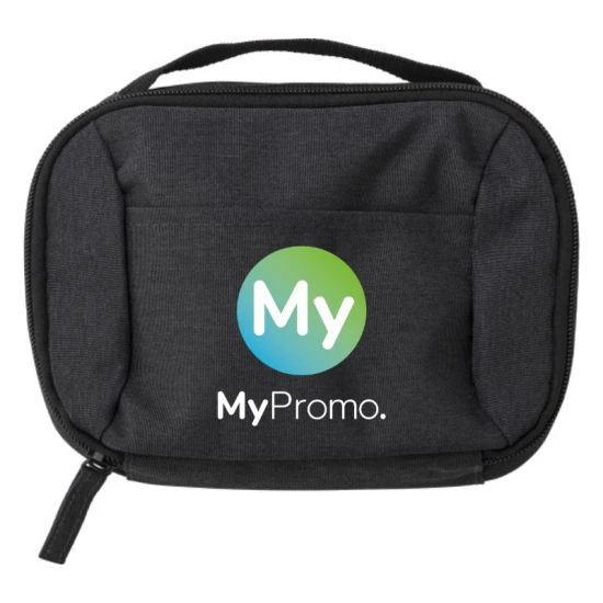 Polyester (600D) travel pouch with short carrying loop. One compartment with multiple pockets for carrying cables and travel documents. One small pocket on the front.