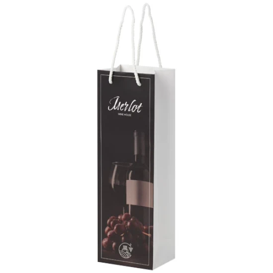 Wine bottle size handmade mattee 170 g/m2 integra paper bag (12 x 9 x 37 cm) with plastic handles. The customisable front and back provide ample space for printing a logo, or any other design, making it an excellent business marketing tool. Made in Europe. Recycled paper, 170 g/m2.