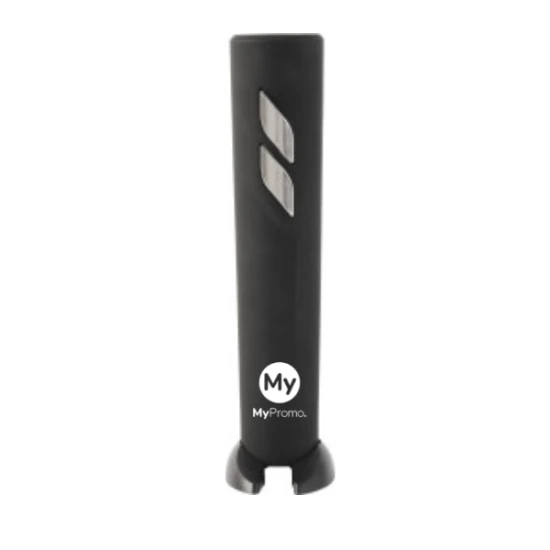 ABS electric bottle opener with matte finish. Two silver push buttons operate the opener and the stand doubles as foil cutter. Batteries included.