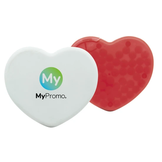 Peppermint box in the shape of a heart. In transparent red or white hardcolour. Circa seven grammes of sugerfree peppermints. Available for full-colour digital print. Product safety directive one every tin.