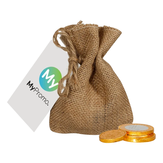 A charming jute bag filled with approximately 50 grams of delicious milk chocolate coins, finished with a full-colour, double-sided printed card. This rustic yet elegant gift combines the natural look of jute with the indulgent taste of chocolate, making it a tasteful choice for thank-you gestures, festive occasions, or as a stylish treat for any event.