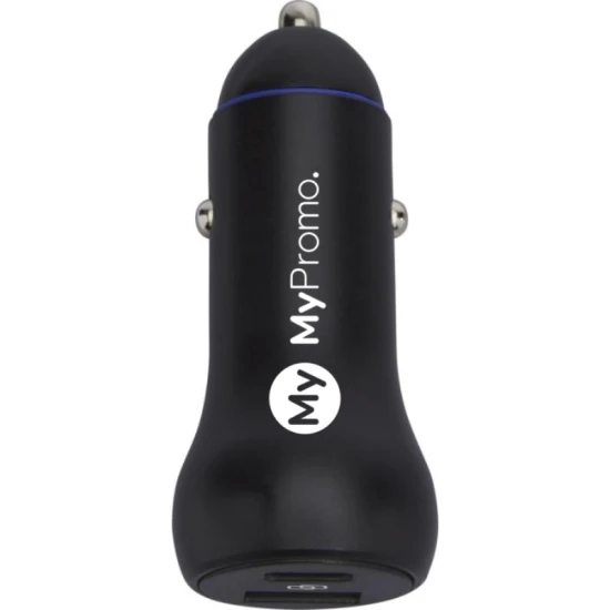 Car charger made of aluminium with USB-C and USB-A output, both supporting quick charge. The output of USB-C is up to 55W, and for USB-A it's up to 22W. Compatible with most mobile phones. If you're tyred of the traditional 5V/1A charging speed, this is a must-have gadget for your car! Delivered in a premium kraft paper box with a colourful sticker. Aluminium, ABS Plastic.