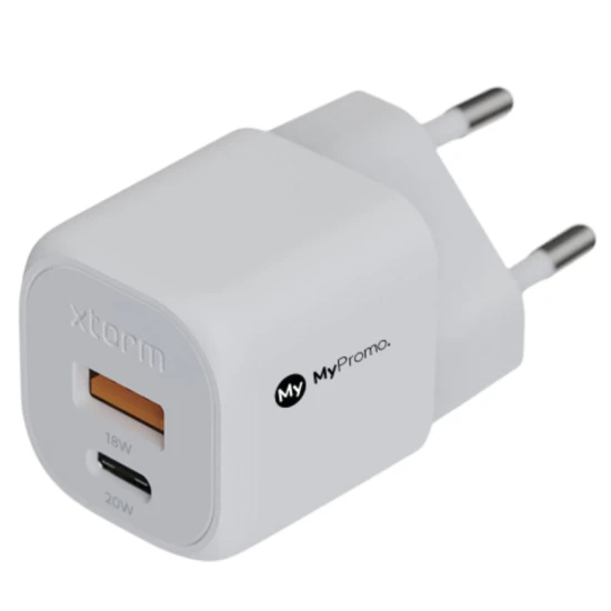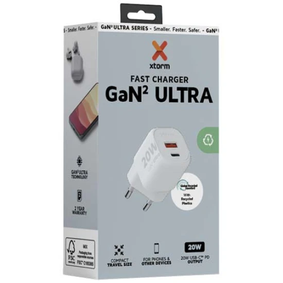 The 20W GaN² Ultra wall charger plug is designed to be more compact and powerful than ever before. With its compact design and dual-port functionality, this wall charger is perfect for your travels, office, or home. To reduce waste and contribute to a more sustainable future, the charger is made from 97% recycled plastic. Output: 1 USB-C 20W power delivery, and 1 USB-A 18W quick charge 3.0. Delivered with a user manual. Recycled ABS Plastic.