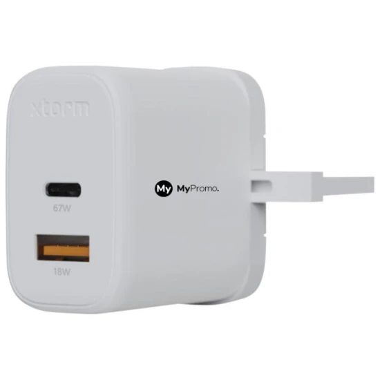 The 67W GaN² Ultra wall charger with UK plug is designed to be more compact and powerful than ever before. With its compact design and dual-port functionality, this wall charger is perfect for your travels, office, or home. To reduce waste and contribute to a more sustainable future, the charger is made from 97% recycled plastic. Output: 1 USB-C 67W power delivery, and 1 USB-A 18W quick charge. Delivered with a user manual. Recycled ABS Plastic.