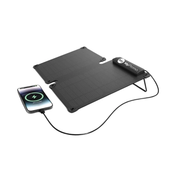 10W double foldable solar panel that allows direct charging to your mobile device, speaker, powerbank or other device. Simply connect your cable to the device while the panel is in sunlight and start charging. Charge rate depends on conditions. The panel uses high quality monocrystalline solar panels with 21% conversion rate. With USB A and Type C output ( max 5V/1A) and charge indicator to show charging speed. Charging speed solar: 5V/2000mA. Made with PET material and RCS certified recycled ABS. Including integrated stand function to use the solar panels at an optimal angle. IPX 6 waterproof. Packed in FSC® mix packaging.