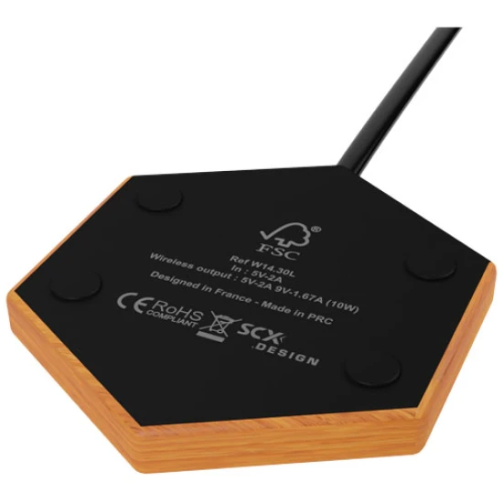 10W wireless charger with hexagonal shape, made of rubber and bamboo with antibacterial treatment and light-up logo. Delivered in a black gift box made of recycled kraft paper including recycled PET plastic cable. Patent EUROPE EUIPO. Wood, ABS Plastic.