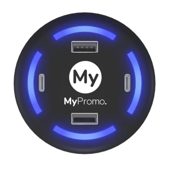 4.2A smart home charger with rubber soft-touch finish and light-up logo. Thanks to the 5V/2.4A ports, up to 4 devices can be charged simultaneously. The charger is equipped with 2.4 USB and 2.4 USB-C outputs. Each port has a blue light indicator which lights up when a device is charging. Once the device is fully charged, the indicator turns off to save energy. EU and US outlet plugs included. Packed in recycled kraft paper box (9.8 x 12.3 x 5.3 cm). Includes 3 year warranty. ABS Plastic.