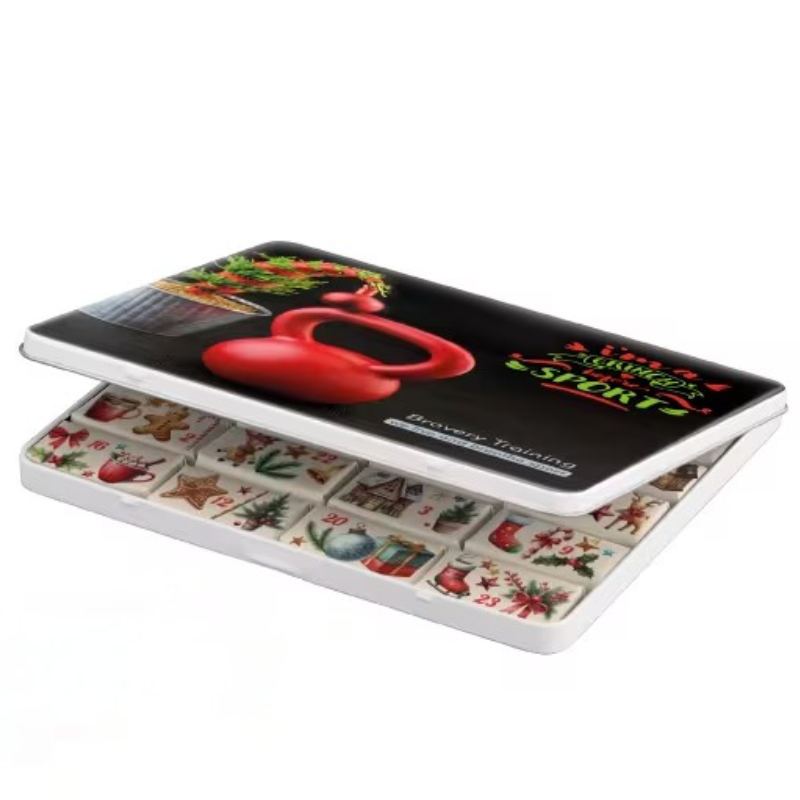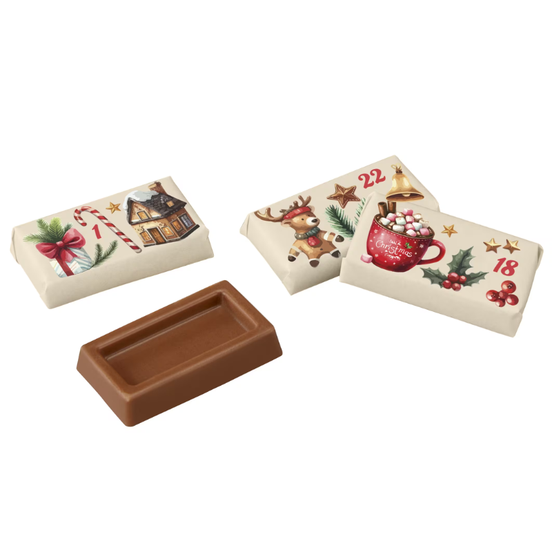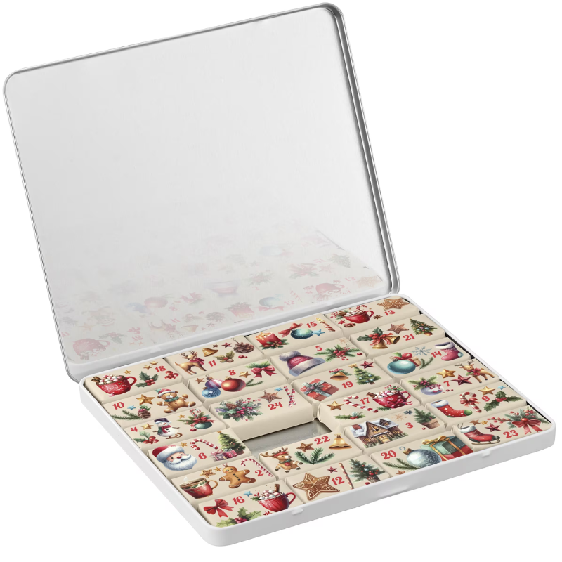 Discover our decorative Advent calendar in a stylish tin filled with 24 individually printed and wrapped chocolates. Personalize it with a full color imprint on the lid for a unique and festive gift.