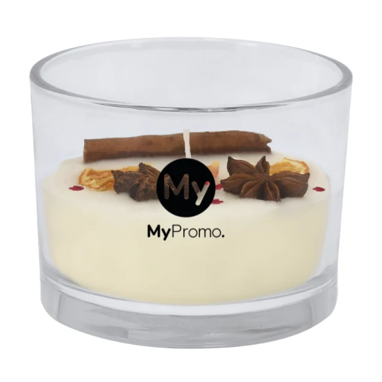 Aromatic candle made with vegetable wax and cinnamon _amp; citrus fragrance. Decorated on top with pink flower petals, a cinnamon stick, dried orange slices and star anise.