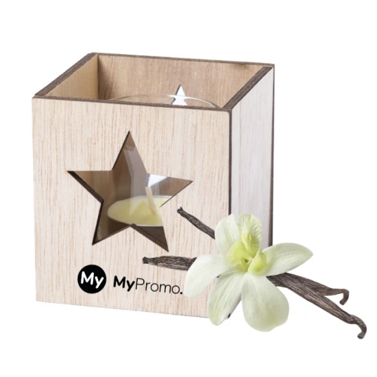 Nature line, vanilla scented christmas candle. Made of glass, with die-cut wooden box in an original design. Presented in an individual box in natural colour.