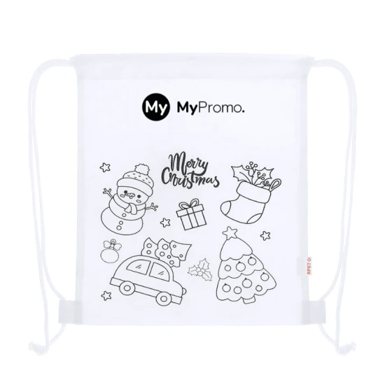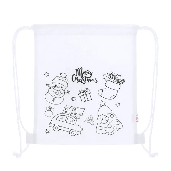 Children's Christmas backpack made of non-woven RPET, specially designed for colouring with crayons. With fun Christmas drawings, including 4 crayons in different colours. It has self-closing strings and fabric fasteners, and a RPET label outside.RPET material is made from recycled plastic, thus promoting the reuse of plastic waste and helping the sustainability of the planet.