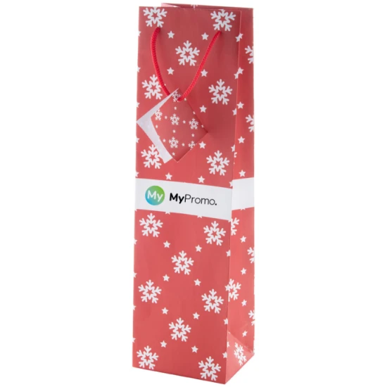 Matte laminated paper gift bag for wine bottle with Christmas design, white printing area and gift tag.
