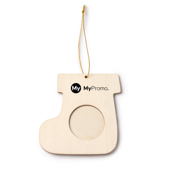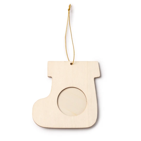 A charming wooden Christmas decoration featuring an integrated photo frame. Perfect for personalising your tree with memories and festive cheer. Photo frame diameter 4.5cm.