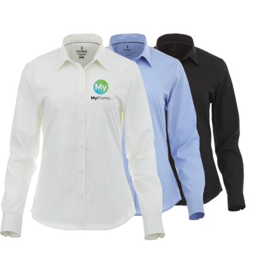 Stretch fabric. Adjustable cuff with single pleat. Shaped seams and tapered waist for flattering fit. Satin piping at inside neck. Dyed-to-match engraved buttons. Heat transfer main label for tagless comfort. Poplin of 97% Cotton and 3% Elastane, 118 g/m2.