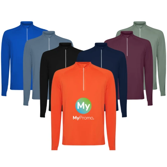 Long-sleeve technical raglan sweatshirt for men. Collar with a half zip inverted design featuring reflective details. Reinforced seam covers. Cuffs with thumb openings. Reflective details on the back. Back hem slightly longer than the front. Warm brushed inner fabric. Knit of 88% Recycled Polyester and 12% Elastane, 200 g/m2.