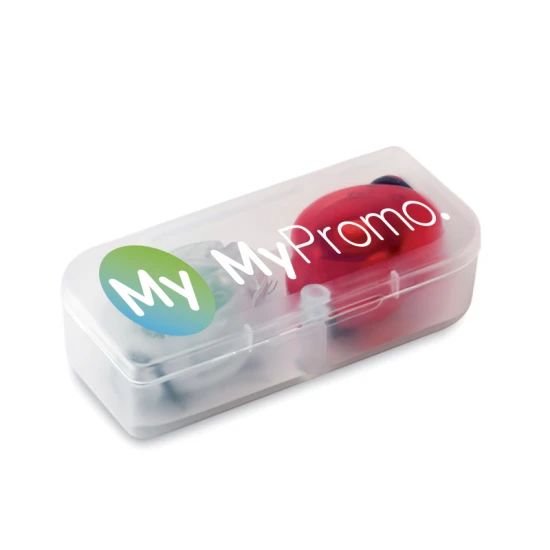 Set of 2 red and white additional lights for bicycle and outdoor use. Delivered in frosty white PP box. 2 button cells included.