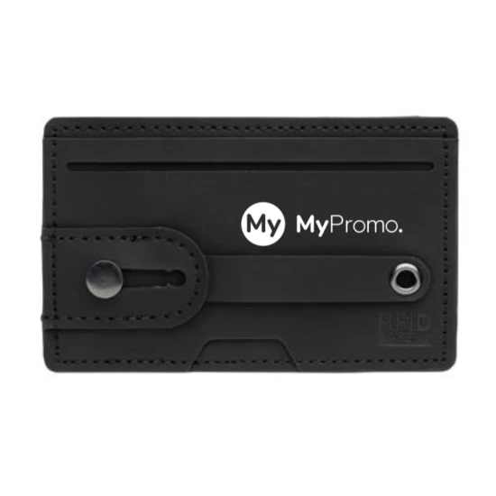 PU material RFID card wallet that can also be used as phone holder and stand. This RFID cardholder can fit up to 2 bank cards or ID cards and will keep them protected from unauthorised scans and fraudulent activities. The adhesive tape on the back allows you to stick the cardholder to a mobile with a flat surface. The item has a strap that functions both as a holder and as a stand.