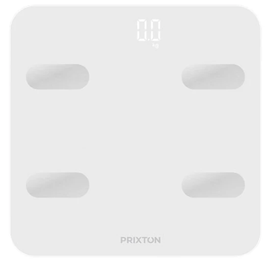 Scale with 13 functions for tracking via an app: body fat, body water, muscle percentage, bone mass, BMR, BMI, visceral fat, standard weight, weight control, fat mass, fat free mass. The application shows the weight in both kilogrammemes and pounds. Integrated Bluetooth. White LCD screen. AAA battery. Maximum weight 180 kg. Glass.
