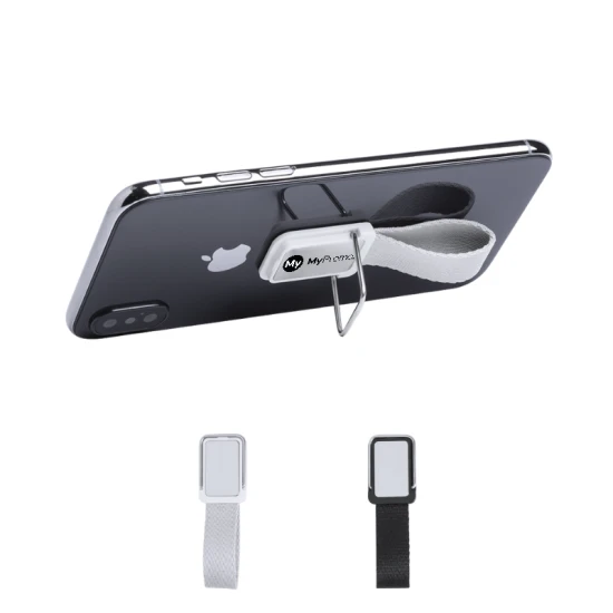 Bold adhesive smartphone holder with strap for your selfies in resistant polyester and a wide printing area. Including metallic holder and presented in an individual design bag.