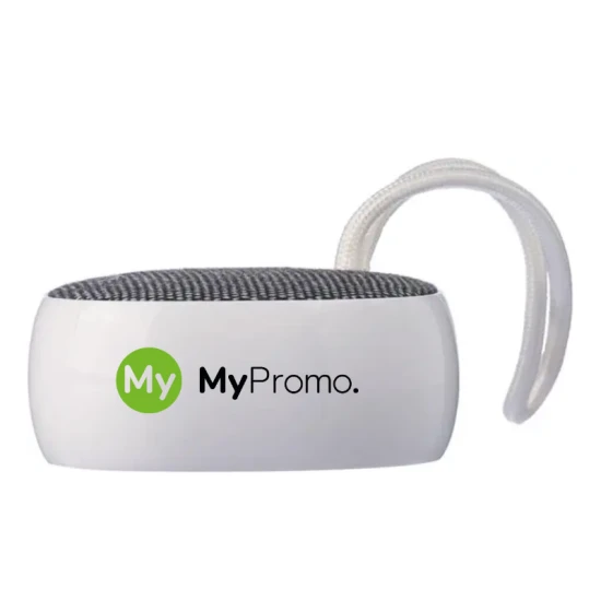 Recycled ABS and rPET fabric wireless speaker with small nylon carrying cord. Battery capacity 300 mAh with 3W output, wireless technology version 5.3, and 10-meter operating range. Charging time approximately 2 hours, with a playback time of 2–3 hours. Includes 30 cm white USB-C charging cable. Features rPET logo on the fabric and recycled ABS logo on the side. Individually packaged in a brown cardboard box.