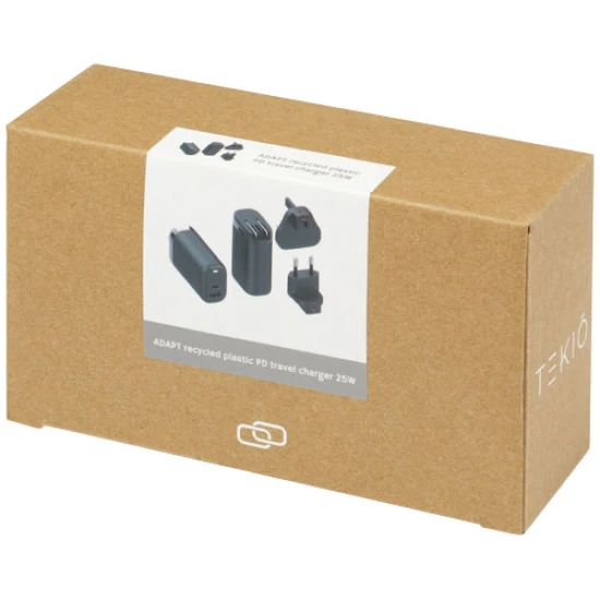 The ADAPT recycled plastic PD travel charger is a compact and environmentally friendly charging solution designed to keep you powered up in style while on the go. With its recycled plastic housing and copper and nickel plated components, this charger offers both durability and sustainability. The charger comes with US, EU and UK plusg, allowing you to use it in various regions with ease. The built-in transformer ensures seamless power conversion for international travel (AC 100-240V 50/60Hz). This travel charger comes with 2 ports (Type-C and USB A) that offer versatile and superfast charging options, and the PPS (Programmemable Power Supply) feature allows for adaptive charging. Delivered in a premium kraft paper box with a colourful sticker. PCR Plastic.