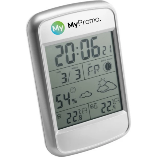 HIPS digital weather station with a sensor for using outside, clock, moon phase, and weather forecast. Batteries included.