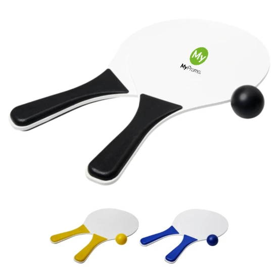 Always fun with this beach game set offered in a wide range of colours. This durable beach game set is made of MDF wood with coloured PP handle. Packed together with an like colour soft ball in an net packing, allowing easy to carry on a fun day to the beach. MDF.