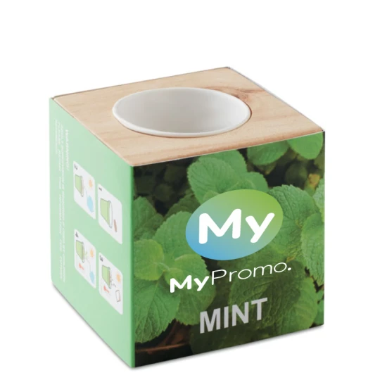 Herb pot in wooden case. With mint seeds.Soil tablet included.