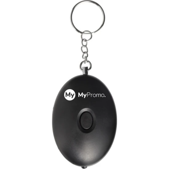 Keyring with a personal alarm and an LED light. The alarm is activated by pulling out the pin. Batteries included. Made from ABS plastic.