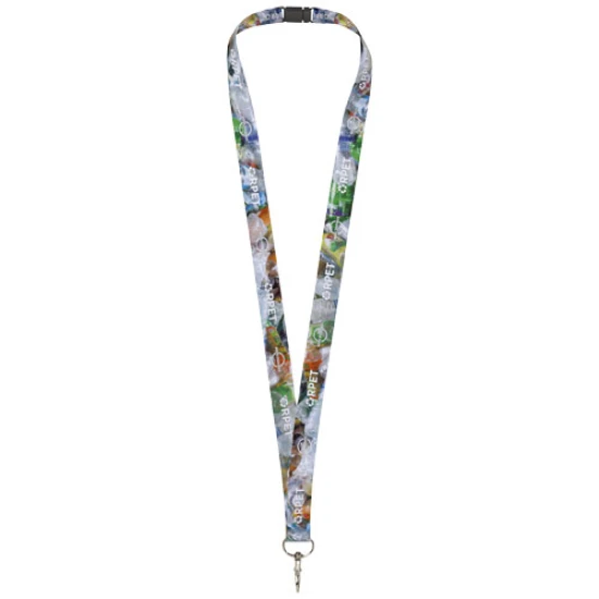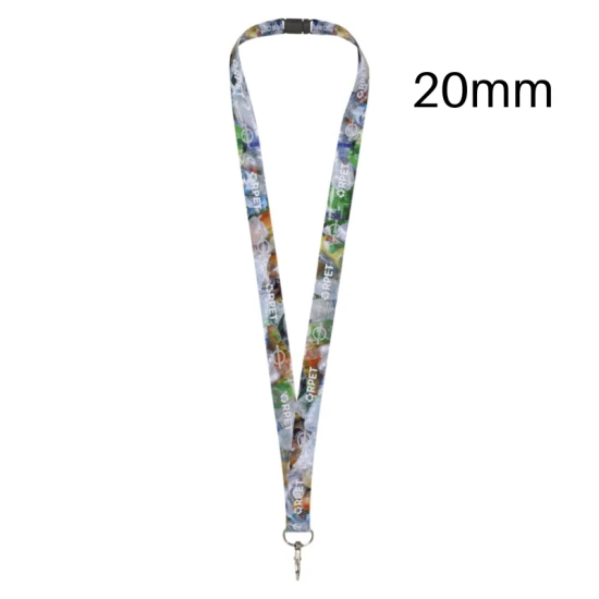 Recycled PET full colour design sublimation lanyard with recycled PET tape, a metal hook, and recycled PET safety break, eliminating choking hazards. Includes full colour decoration on two sides. Can hold a name badge, ID card, or keys. Recycled Polyester.