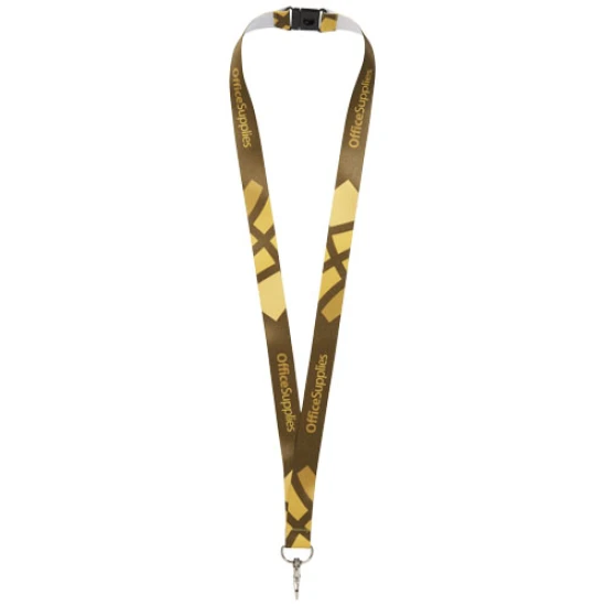 Adel full colour lanyard - single side sublimation. Full colour design sublimation lanyard. This lanyard includes full colour decoration on one side, the back of the lanyard will be white. Lanyard includes a metal hook and safety break eliminating choking hazards. Can hold a name badge, ID card or keys Polyester.