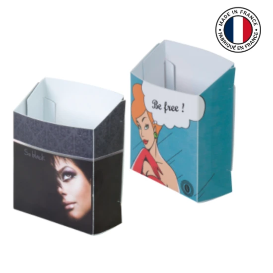 Cigarette pack protector with dimensions of 5.7 x 7.5 x 2.3 cm and a weight of 9g, made from 0.5 mm polypropylene. Made in France. Full-color printing and custom shaping available.