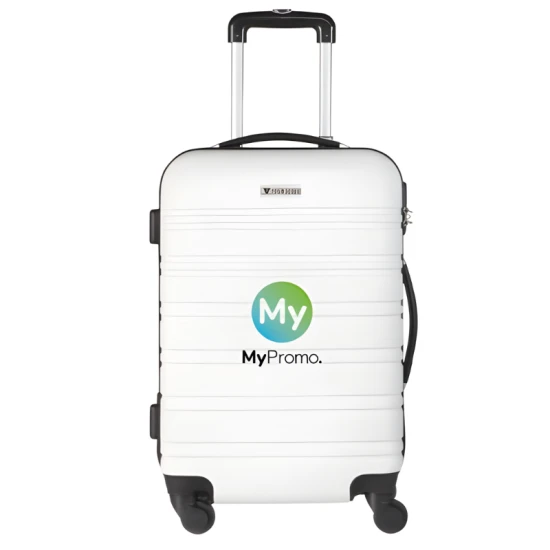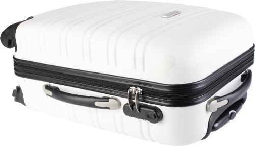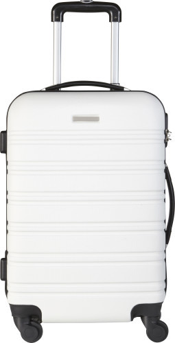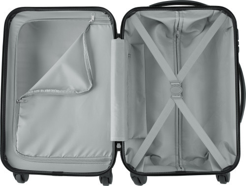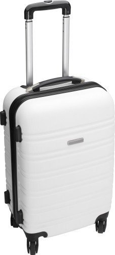 ABS hard case trolley with four wheels, extendable handle, and integrated number lock. Includes metal plate for engraving purposes.