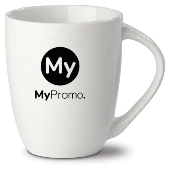A white mug made from high quality porcelain. Made in Europe. Conical model with a large handle.