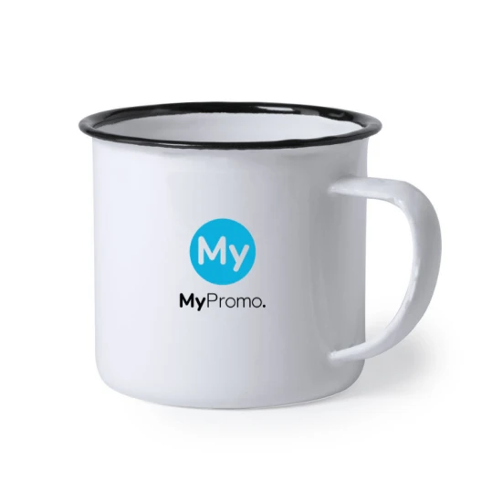 Retro design metal mug in 380ml capacity. Especially designed for sublimation printing, with an elegant black detail and presented in an individual box. Irregular finishing to encourage the vintage look of the mug.