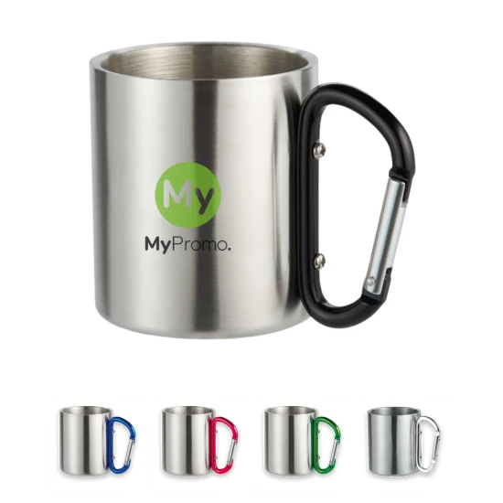 Double wall stainless steel mug, with carabiner handle. Capacity: 220 ml.
