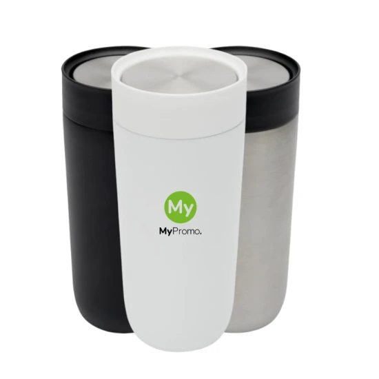 Premium to-go tumbler with a handy stainless steel push-top opening mechanism that allows for one-hand operation. RCS certified stainless steel body with a durable power coating. The lid is made of RCS certified stainless steel and PP plastic. Copper plating and ceramic lining. Fits most common car cup holders. Keeps drinks 12 hours hot or 24 hours cold. Presented in a recycled cardboard gift box. Volume capacity: 350 ml. RCS certified recycled stainless steel.